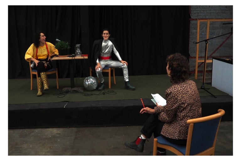 Nous sommes en 660 après la grève du miel, en plein Flegmocène, sur le plateau radio de la charismatique et minérale Calypso. Elle y reçoit Luisa, anthropolichinelle rattachée au Ministère dynamique de l’Insubordination, laboratoire de recherche transdisciplinaire, qui vient présenter les plus récentes hypothèses de son équipe concernant l’ère géologique précédente, le Dualocène. Les pièces géologiques retrouvées sur les fouilles sont des enregistrements qui peignent, tout en hypothèses et en conjectures, le portrait d’un ancien monde étrange où les choses marchent par deux, où toute une partie du monde court après le temps, tandis qu’une autre est exploitée. La seconde partie du spectacle est le récit de la dette coloniale, rapportée comme un épisode de la mythologie grecque.