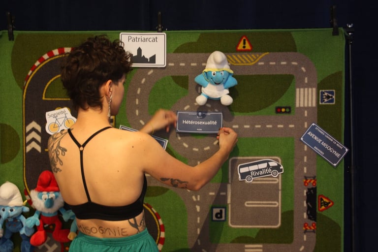 Friand·e d’histoires depuis toujours, j'ai commencé par l’étudier avec sa majuscule dans les amphithéâtres avant d’axer ma recherche sur le théâtre de l'opprimé·e dès 2016. En plus d'en pratiquer depuis ce moment-là, j'aime expérimenter et y mêler d’autres formes artistiques, comme la photographie. Je touche également aux arts plastiques et à l’écriture. Quand le projet se fait collectif, c’est pour moi une sorte de recherche de nouvelles formes de narration du monde vécu quotidiennement et politiquement par celles et ceux qu’on entend moins. Lier le vécu intime avec celui d’un groupe par le geste artistique se fait donc acte politique et, même à petite échelle, espère être porteur de changement. Ces dernières années, j'ai privilégié les projets participatifs autour des questions de genres et de l’espace public. Actuellement à Bruxelles, je suis souvent en vadrouille dans le Nord de la France pour y réaliser des créations collectives, principalement en quartier prioritaire (Lille 2021-2024) et en milieu rural du Pas-de-Calais (2025). Je tourne également une conférence gesticulée « Fallait (pas !) nous crêper le chignon » sur les amitiés et rivalités féminines.